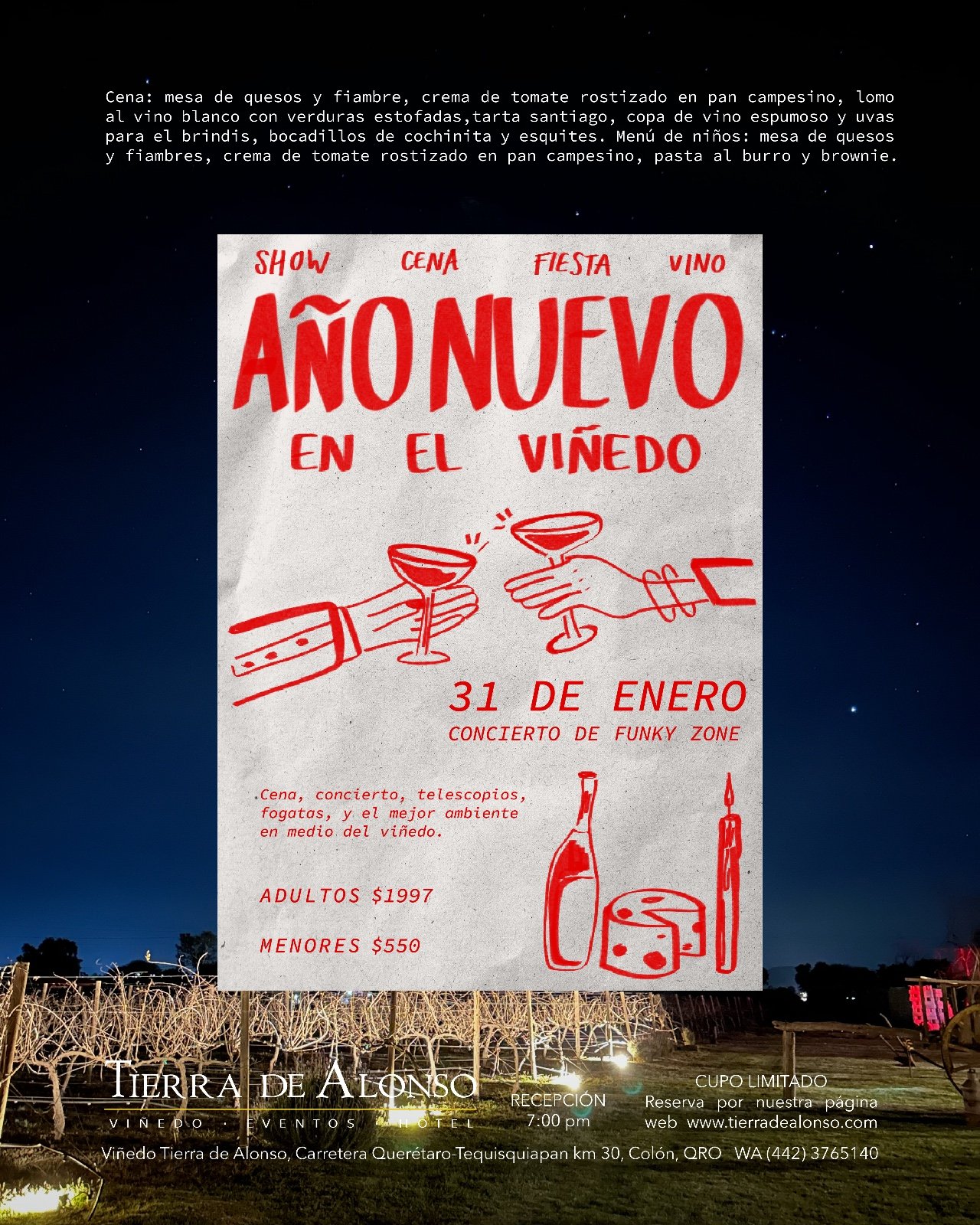 ¡Recibamos el Año Nuevo entre vino, estrellas y música! 🍾✨ Este 31 de diciembre despide el año en el viñedo con cena, fogata, telescopios y el mejor ambiente bajo el cielo de Querétaro 🌌🍷