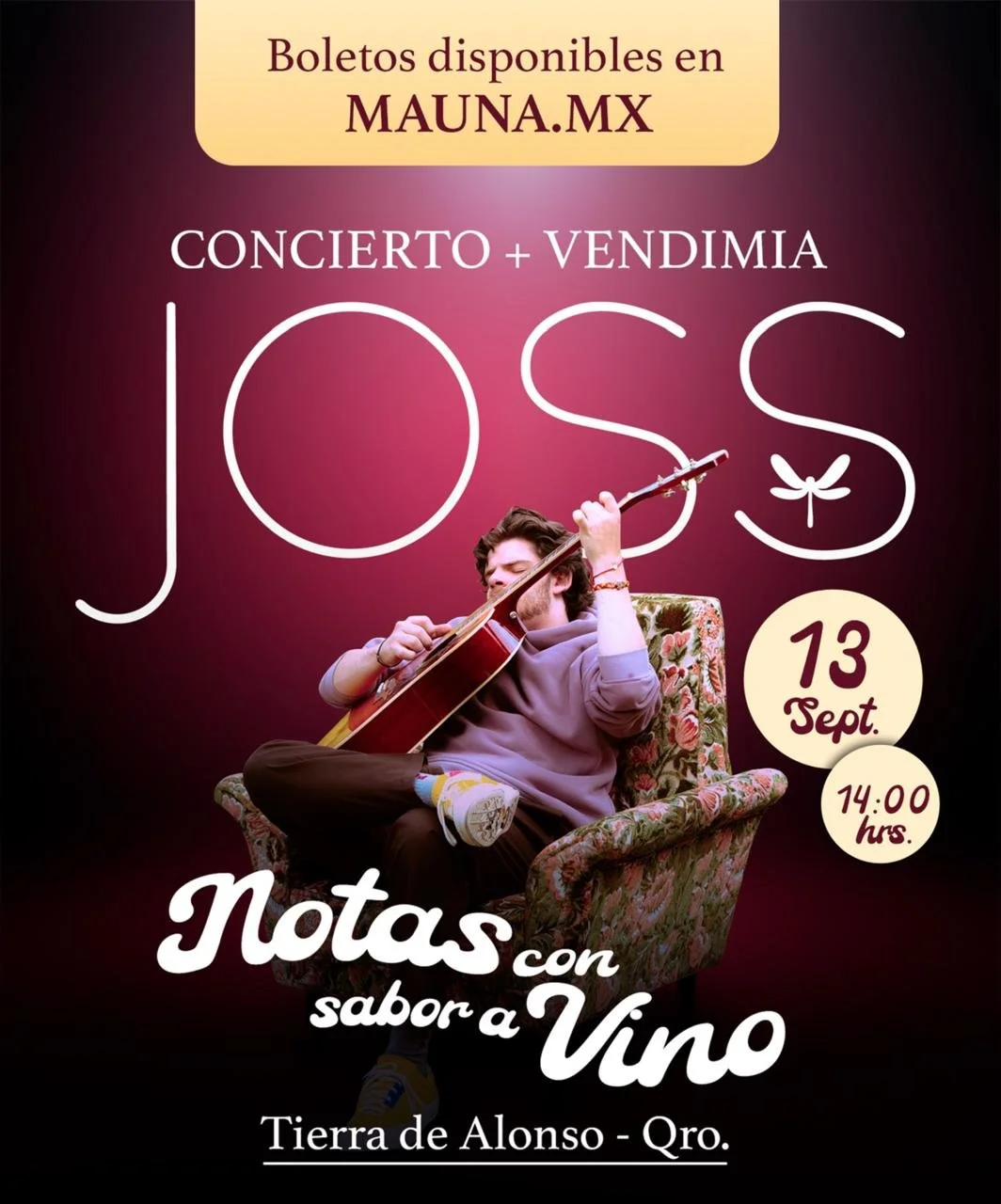 Incluye: Pisado de uvas, música en vivo, recorrido por viñedo y cavas y gran concierto de Joss.
